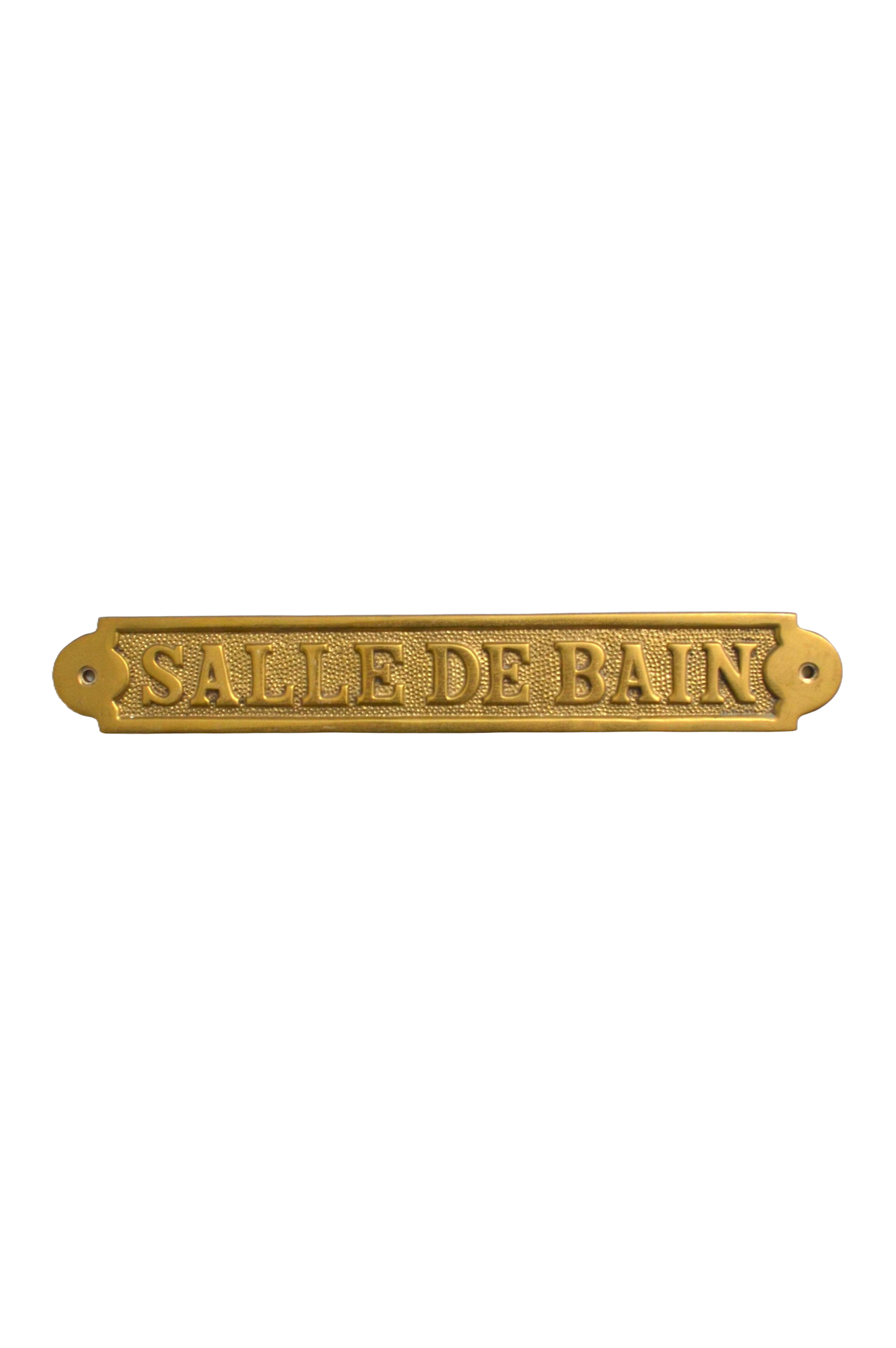 Cette superbe plaque décorative se compose d'une plaque en laiton tout en longueur aux extrémités arrondies. Elle indique en lettre dorées les mots "Salle de bain". Elle est également percée en deux endroits pour pouvoir être accrochée à une porte ou à un mur.