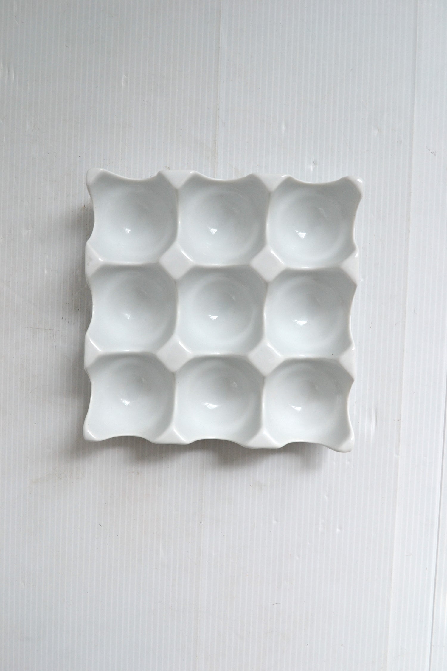 Esthétique et finement dessiné ce plateau est singulier mais aussi utile. Il est en effet équipé de 9 compartiments qui accueilleront autant d'œufs. On s'en servira pour aller récupérer la ponte du jour au jardin afin de la ramener en sûreté et au frais au frigo tout comme il pourra être placé au centre d'une table pour présenter des œufs durs.