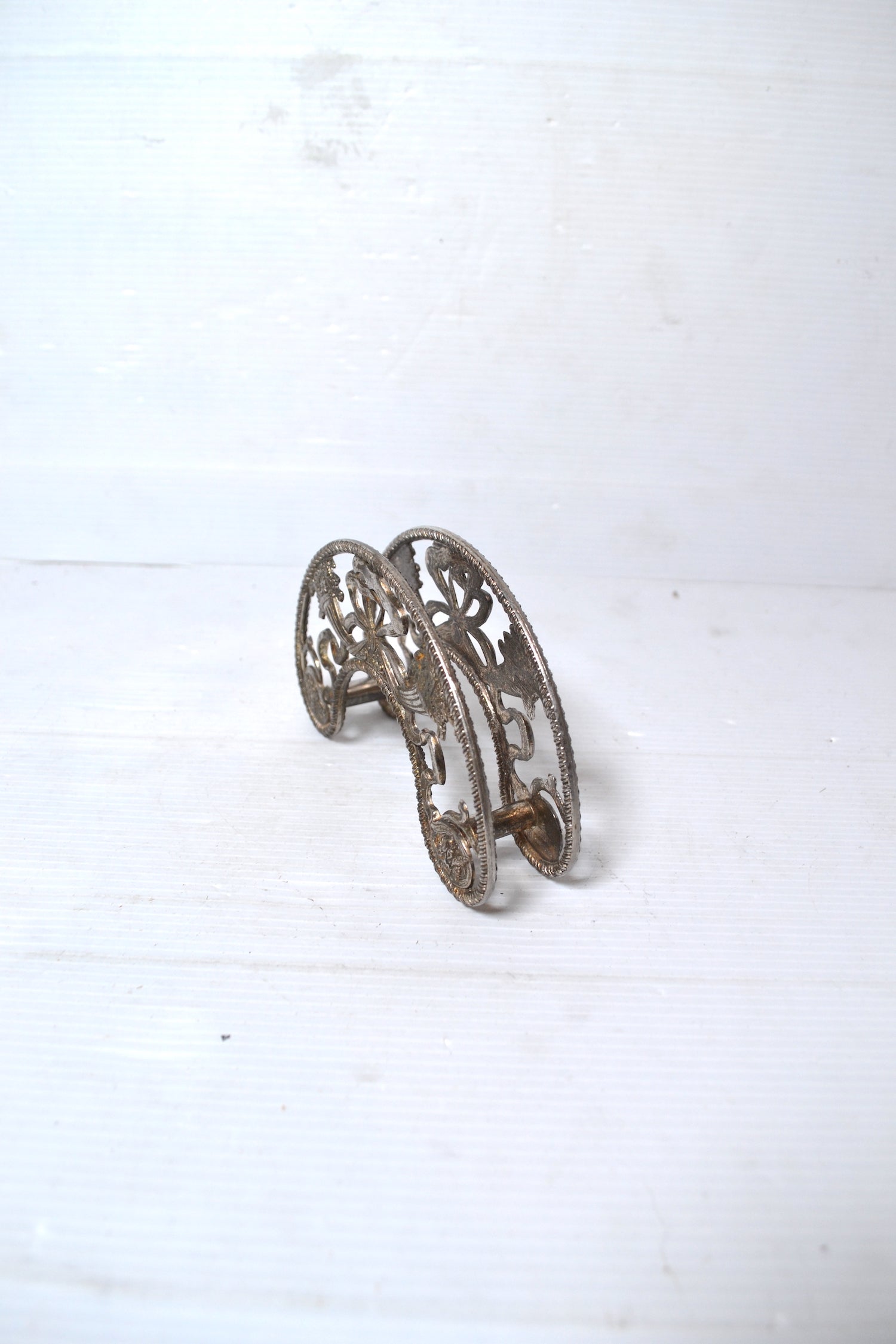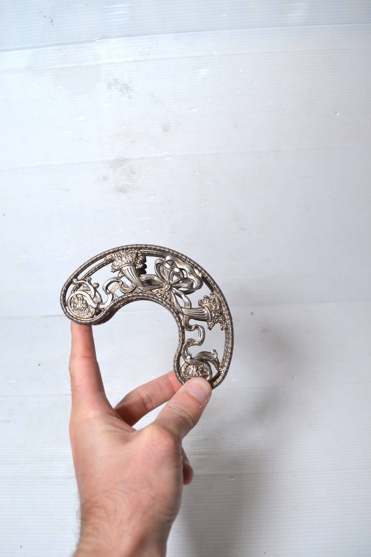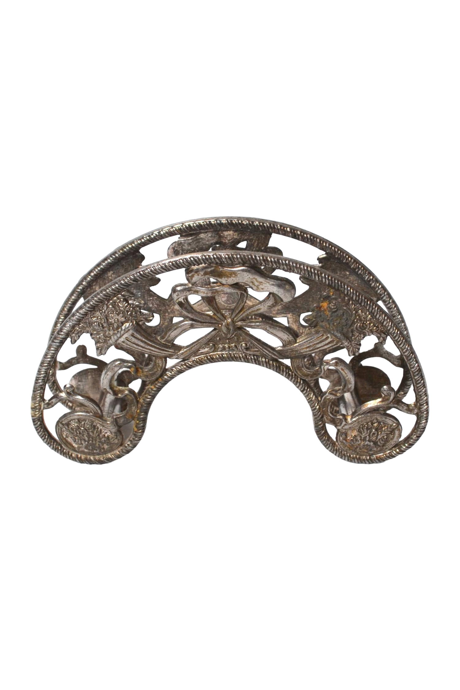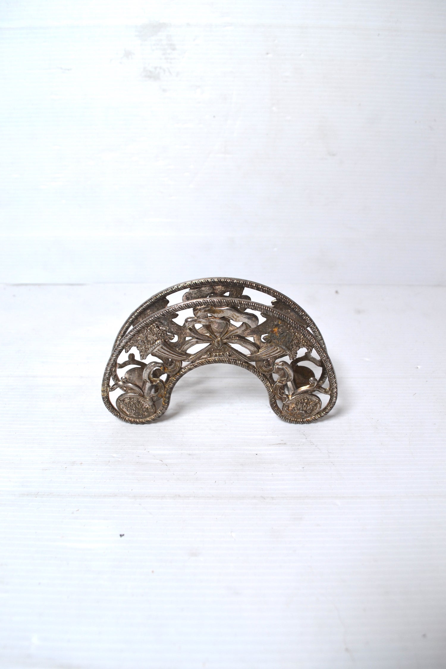 Ce joli porte-courrier vintage se distingue par la richesse de ses ornements en forme de nœuds et de corbeilles fleuries. Un accessoire de bureau vintage qu'on pourrait utiliser pour présenter un beau livre fin, un tableau ou un cadre sur un ancien buffet en bois ou dans un coin bibliothèque.
