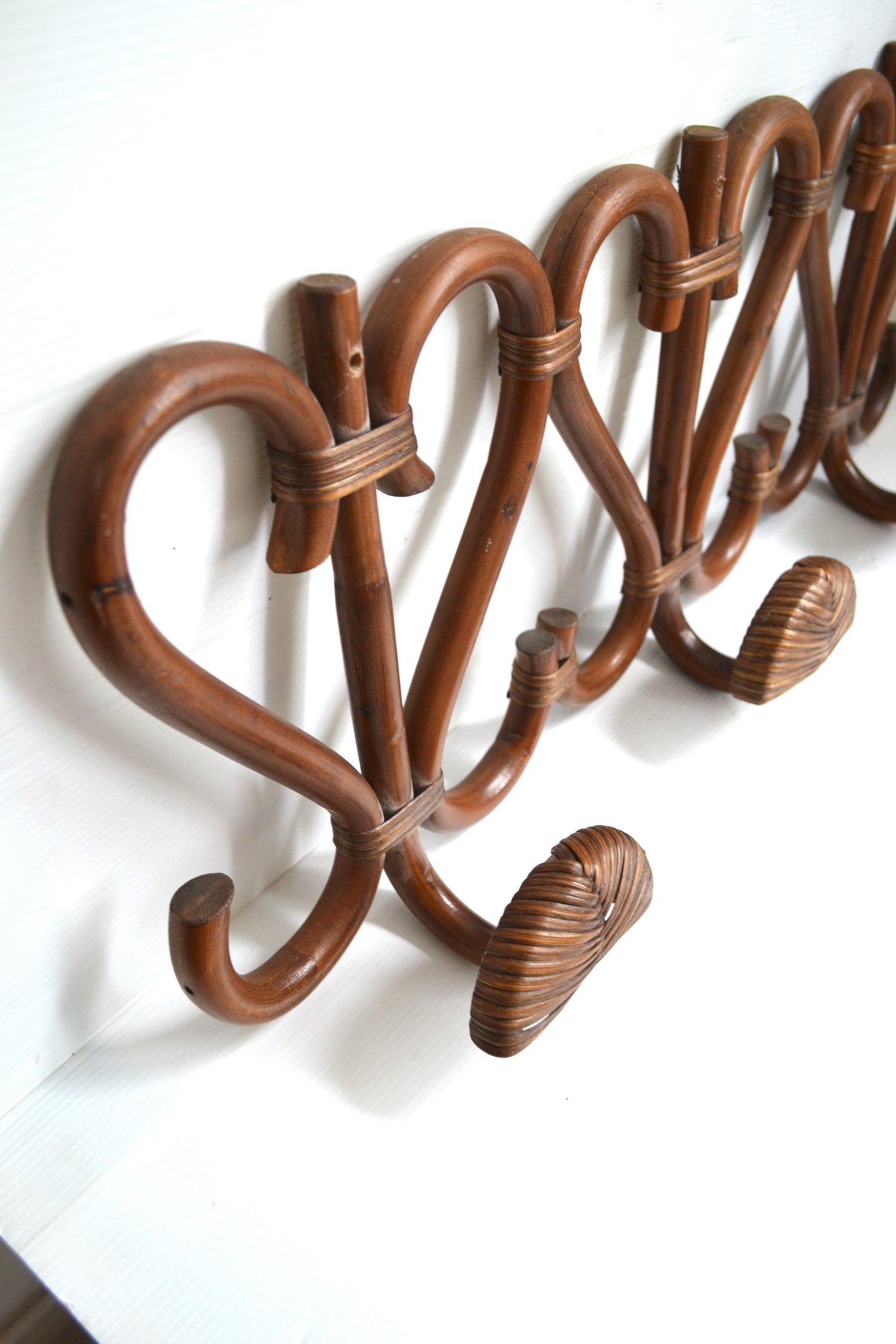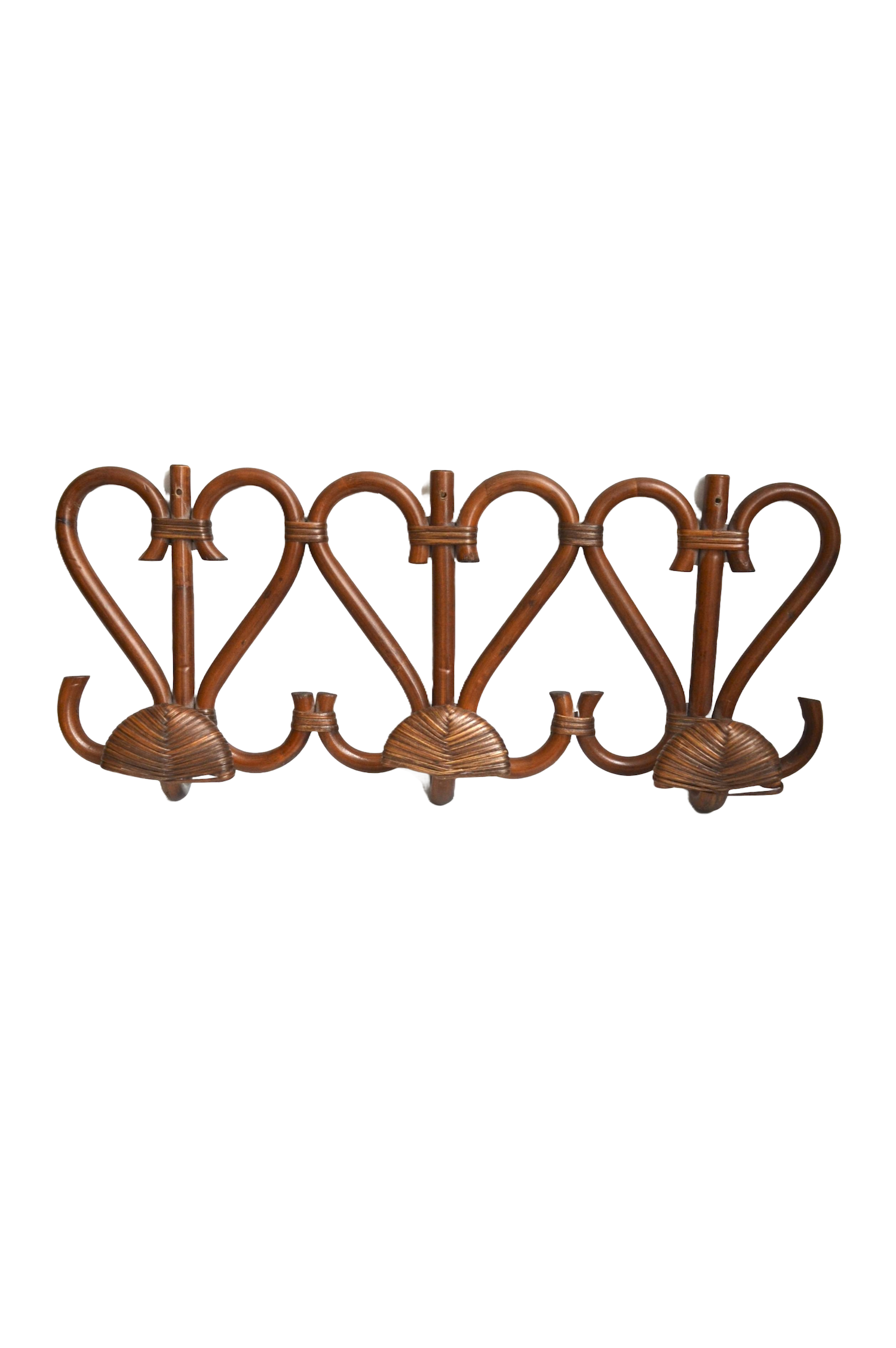 Ce joli portemanteau mural vintage en rotin se distingue aussi bien par sa belle matière naturelle que par son design en forme de cœurs.