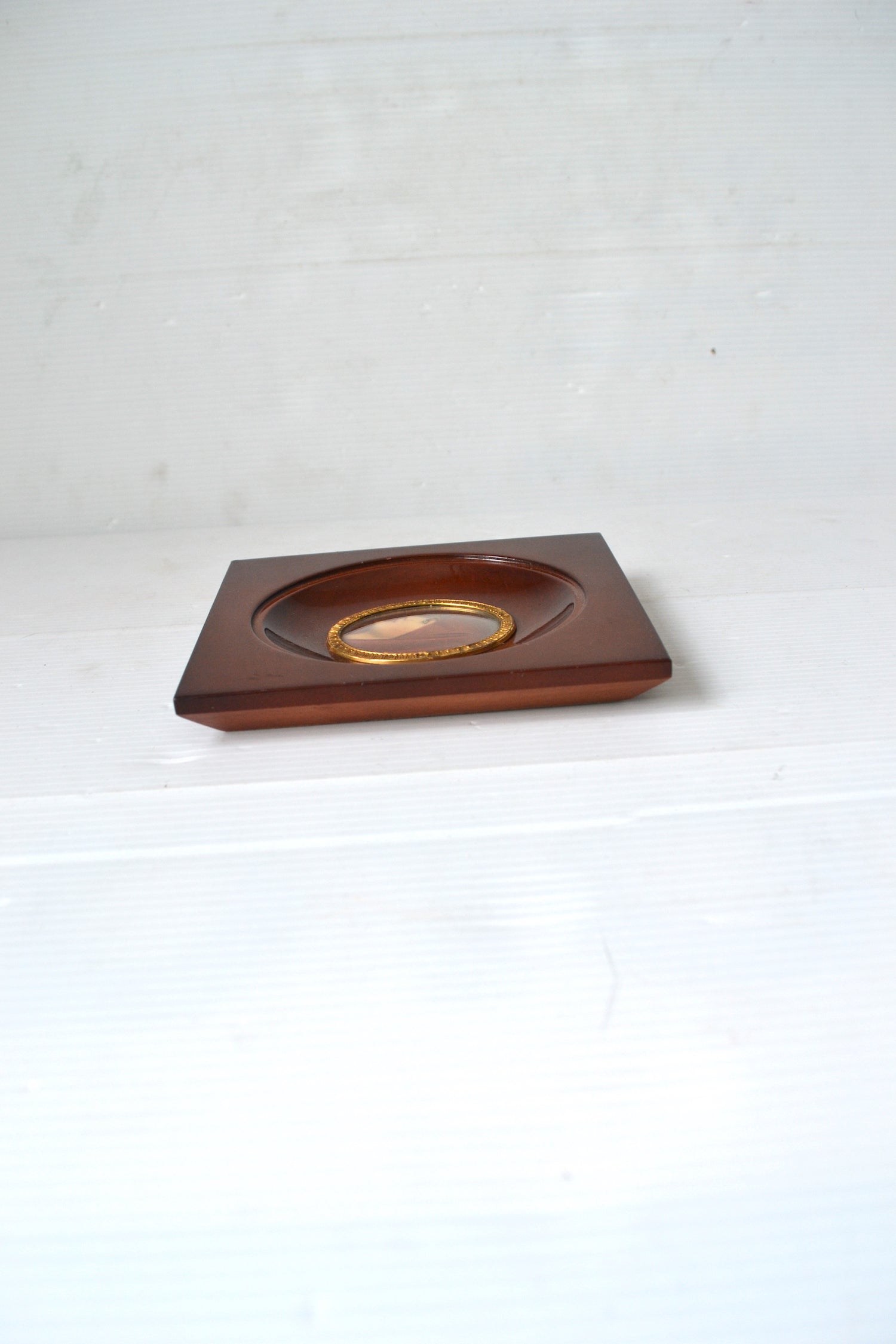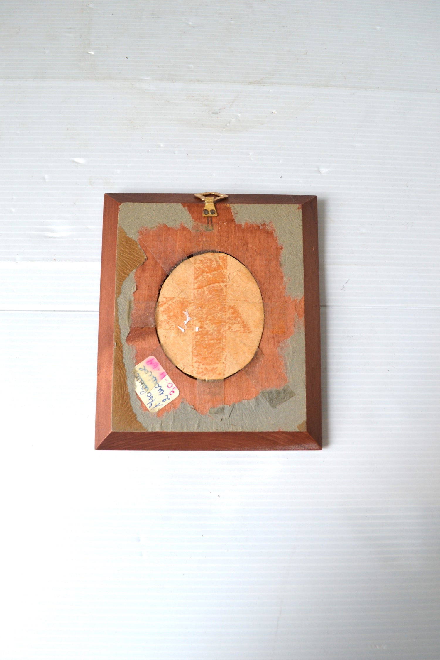 Ce très joli cadre vintage en bois se compose d'une peinture centrale sous forme de portrait de jeune femme, d'une petite vitre au verre bombé, d'un liseré doré et d'un panneau de bois coloris marron laqué.