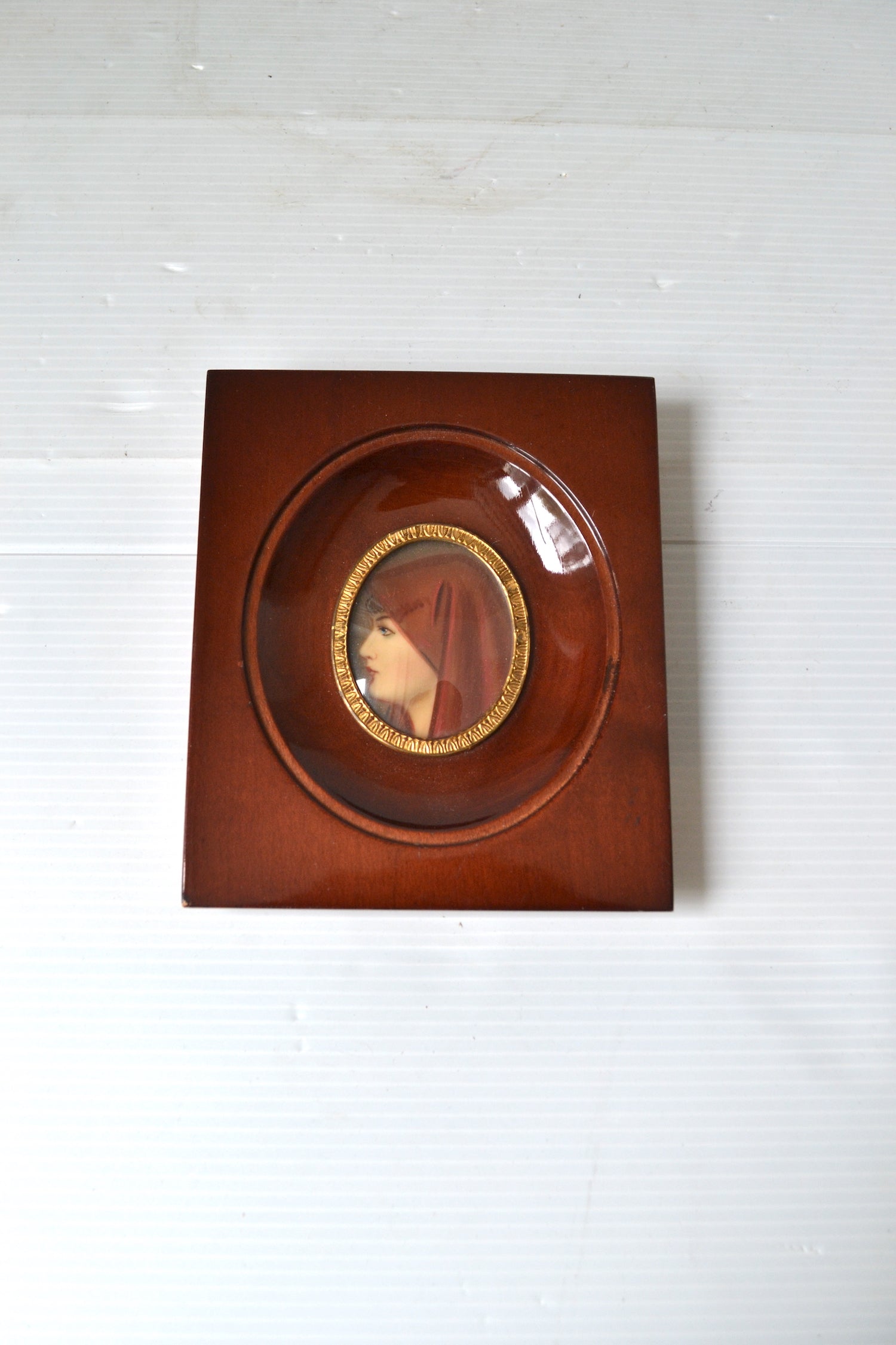 Superbe portrait miniature vintage sous verre bombé dans un cadre en bois