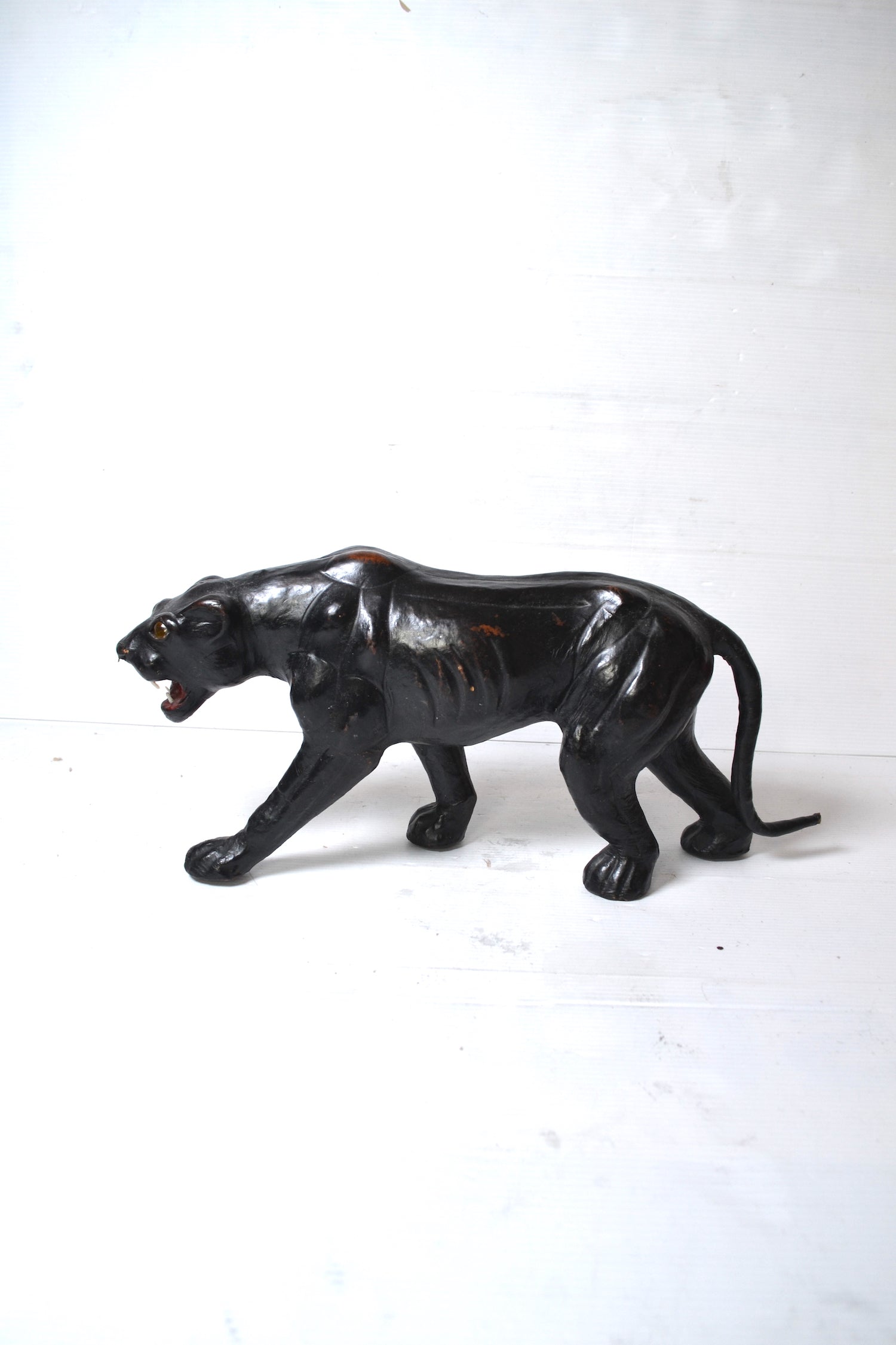 Cette lionne en similicuir se démarque par sa belle couleur sombre ainsi que par sa fabrication manuelle artisanale mais surtout par ses élégantes formes minimalistes. Cette statuette animalière décorative est ainsi un objet particulièrement travaillé et plein de charme.