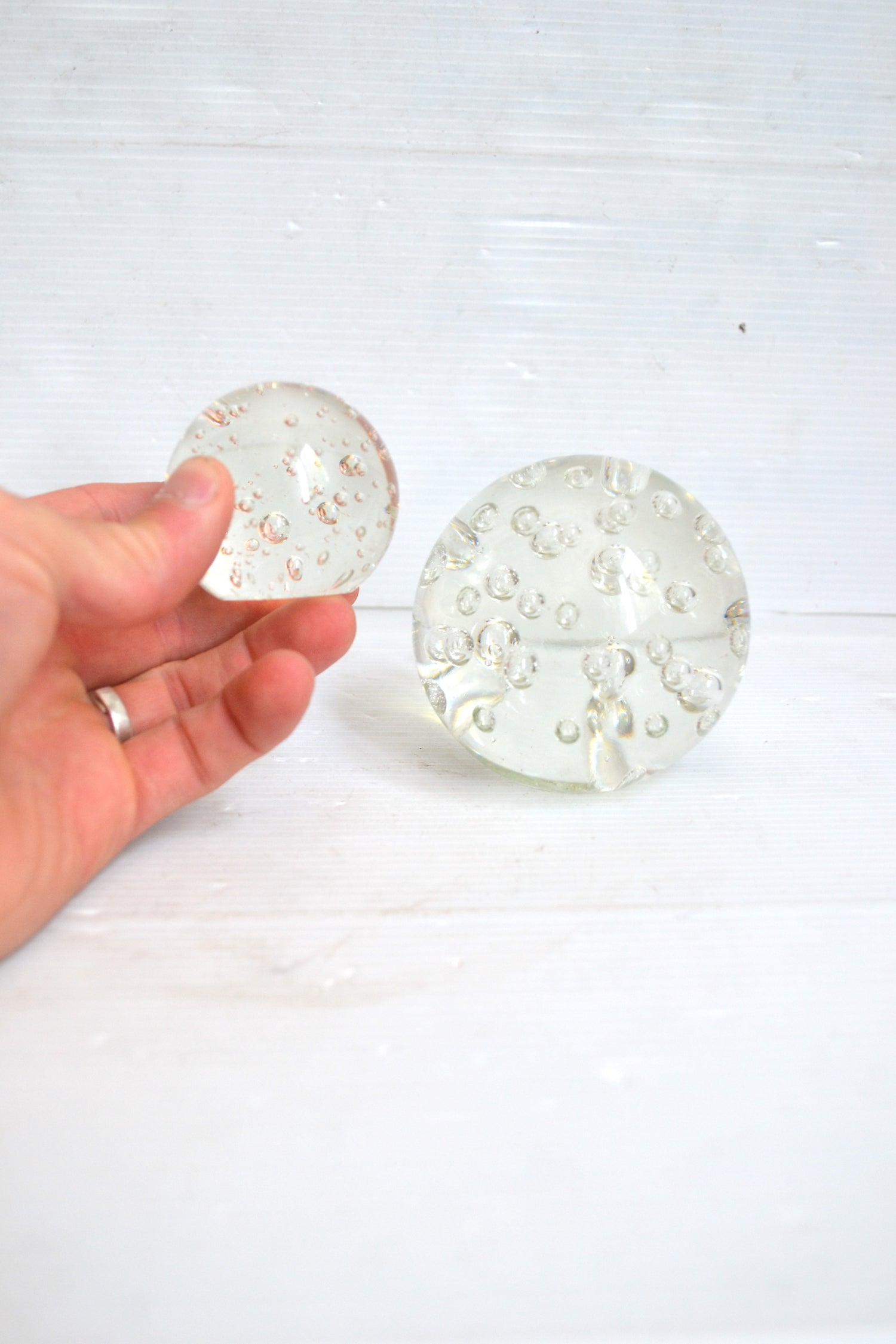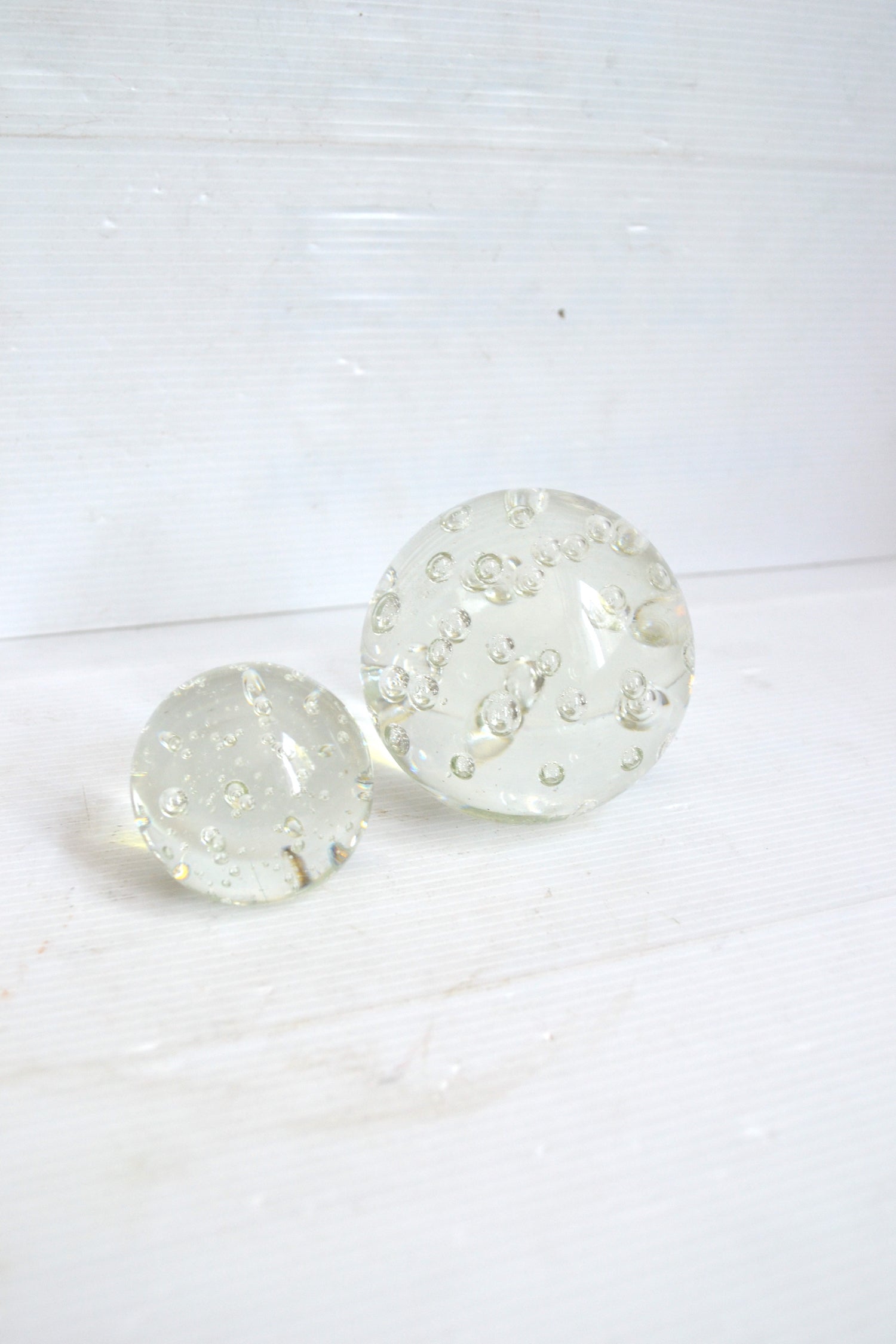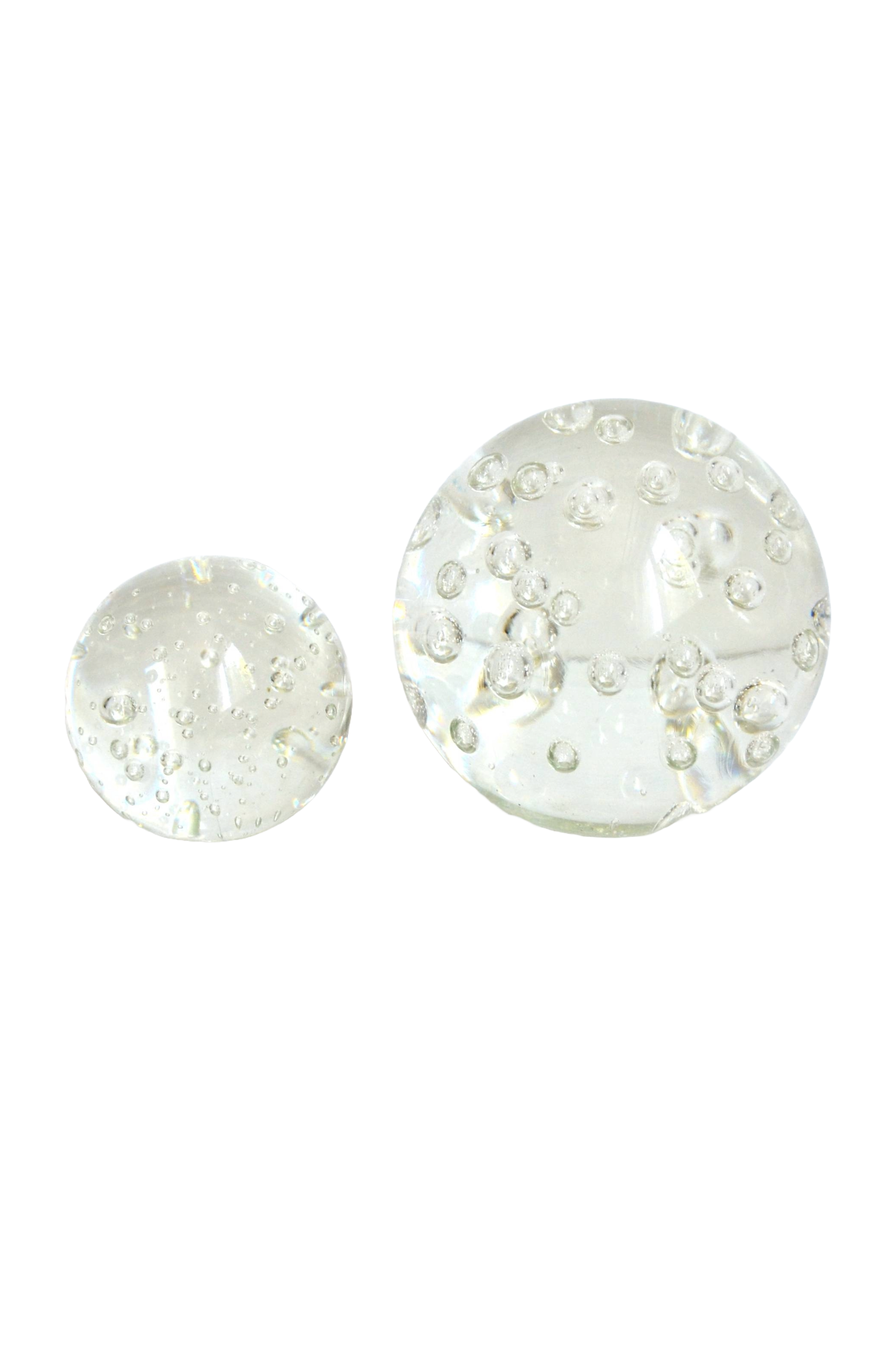 Ces jolis sulfures se démarque par leur forme sphérique comme par leurs très belles bulles d'air emprisonnées. Un duo graphique et design qui se positionnera comme presse-papier sur un bureau de travail, comme bel objet déco sur un buffet parisien ou au centre d'une collection en association avec d'autres sulfures de tailles et de formes différentes.