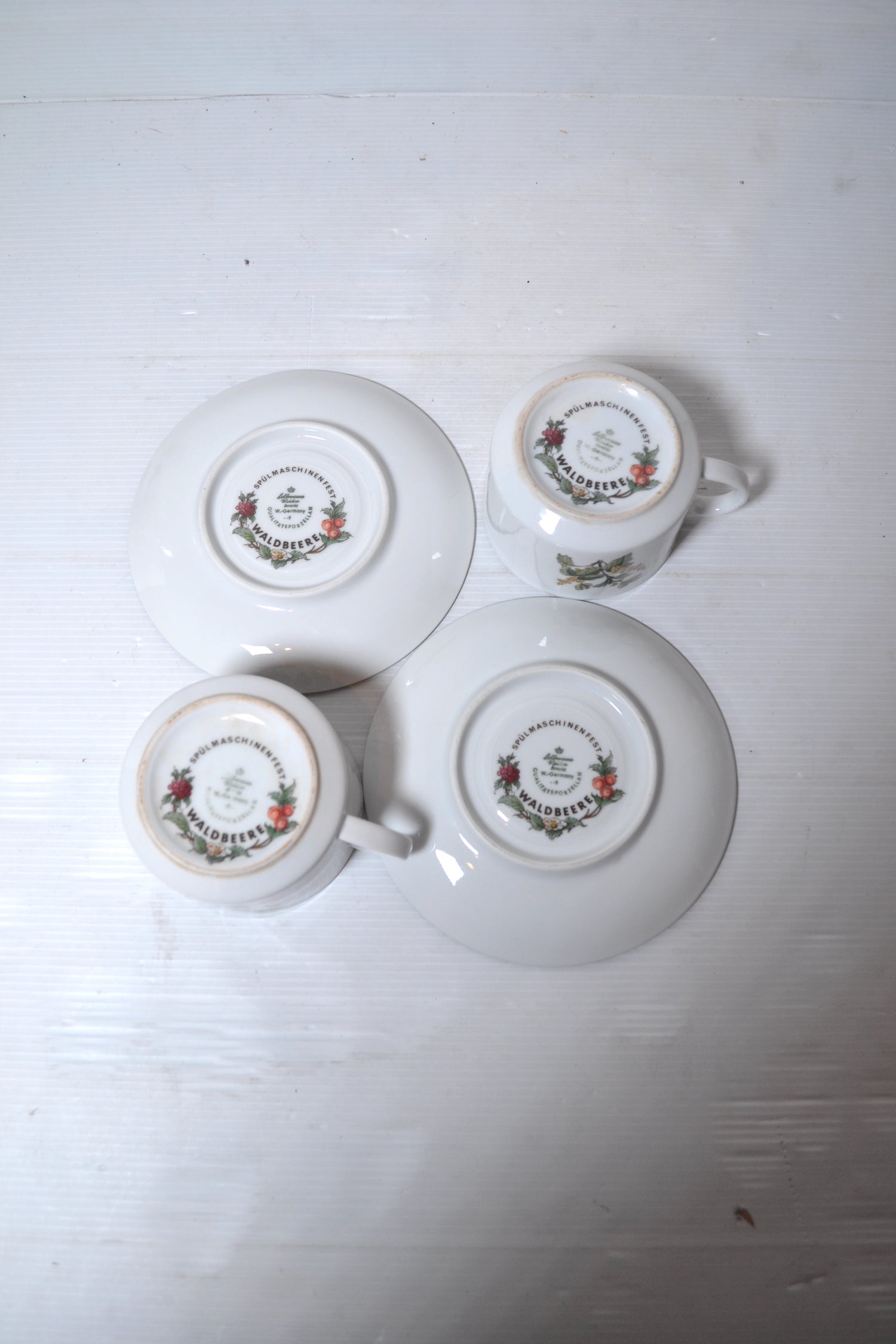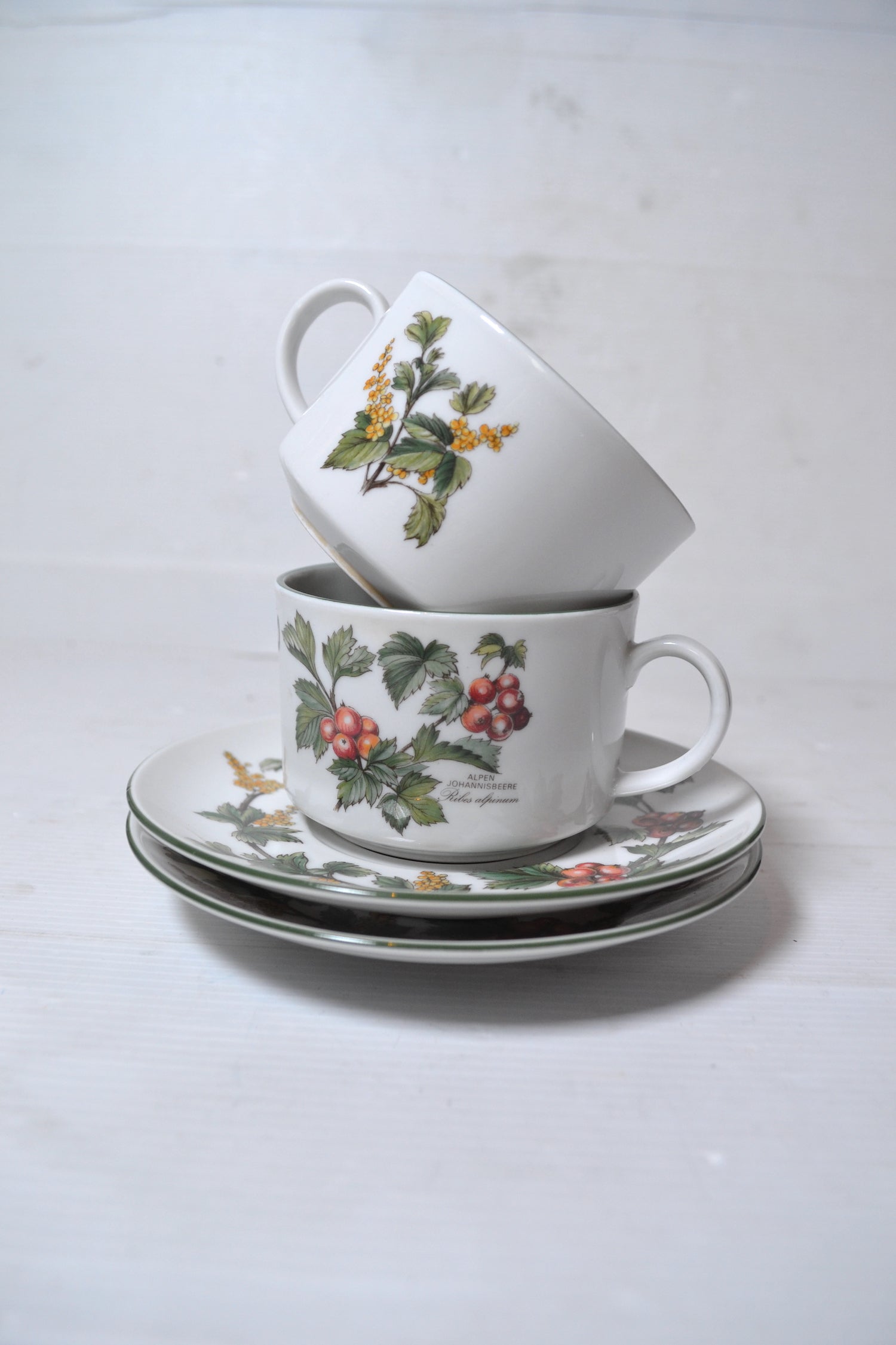 Magnifique duo de tasses et sous tasses en porcelaine motif botanique fabriquées en West Germany. Motif botanique sur le thème Ribes Alpinum par Alpen Johannisbeere