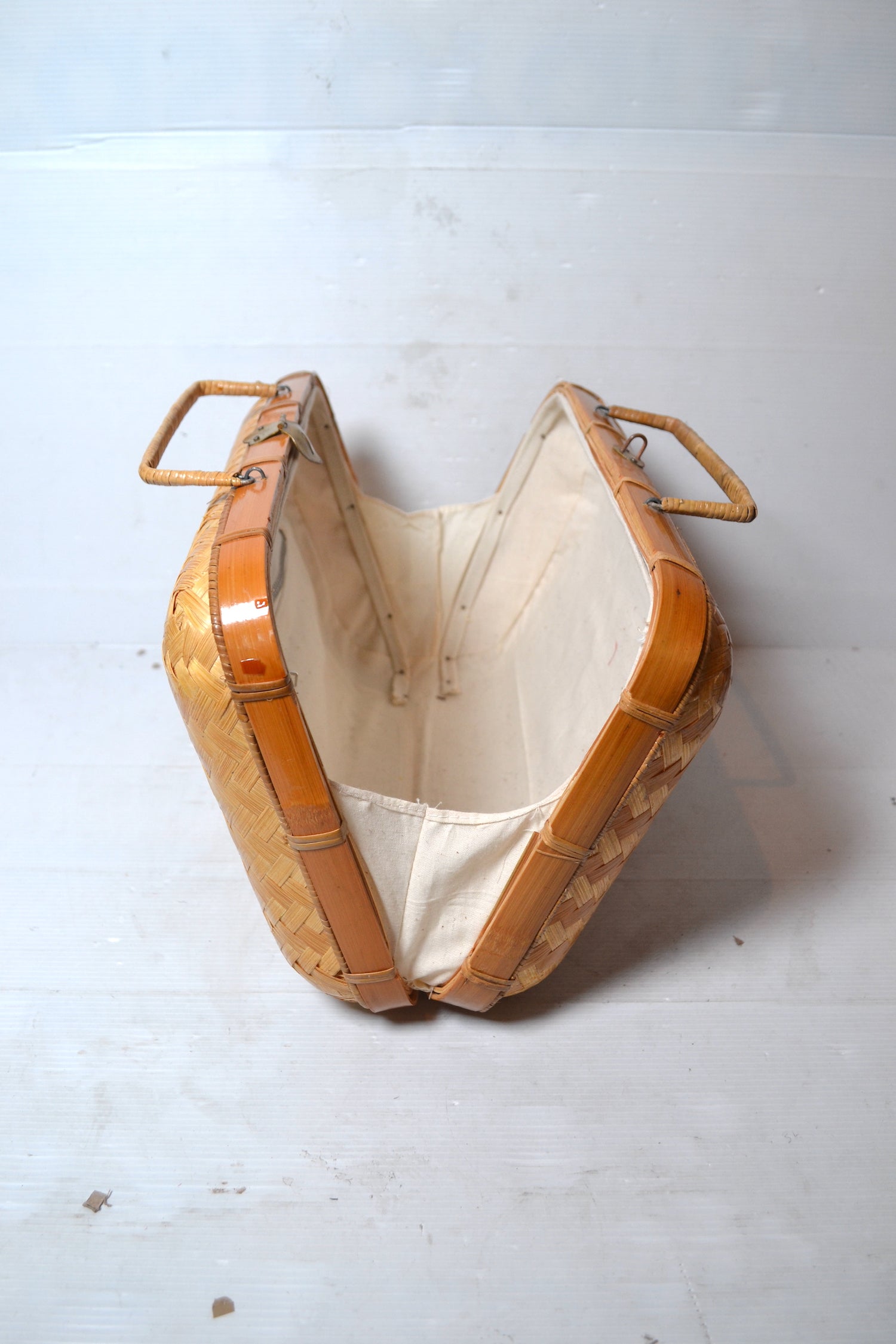 Jolie petite valise vintage en bambou et en osier tressé équipé de deux anses et d'un système de fermeture en métal doré. Une valise tapissée de tissu à l'intérieur et équipée d'une poche à zip.