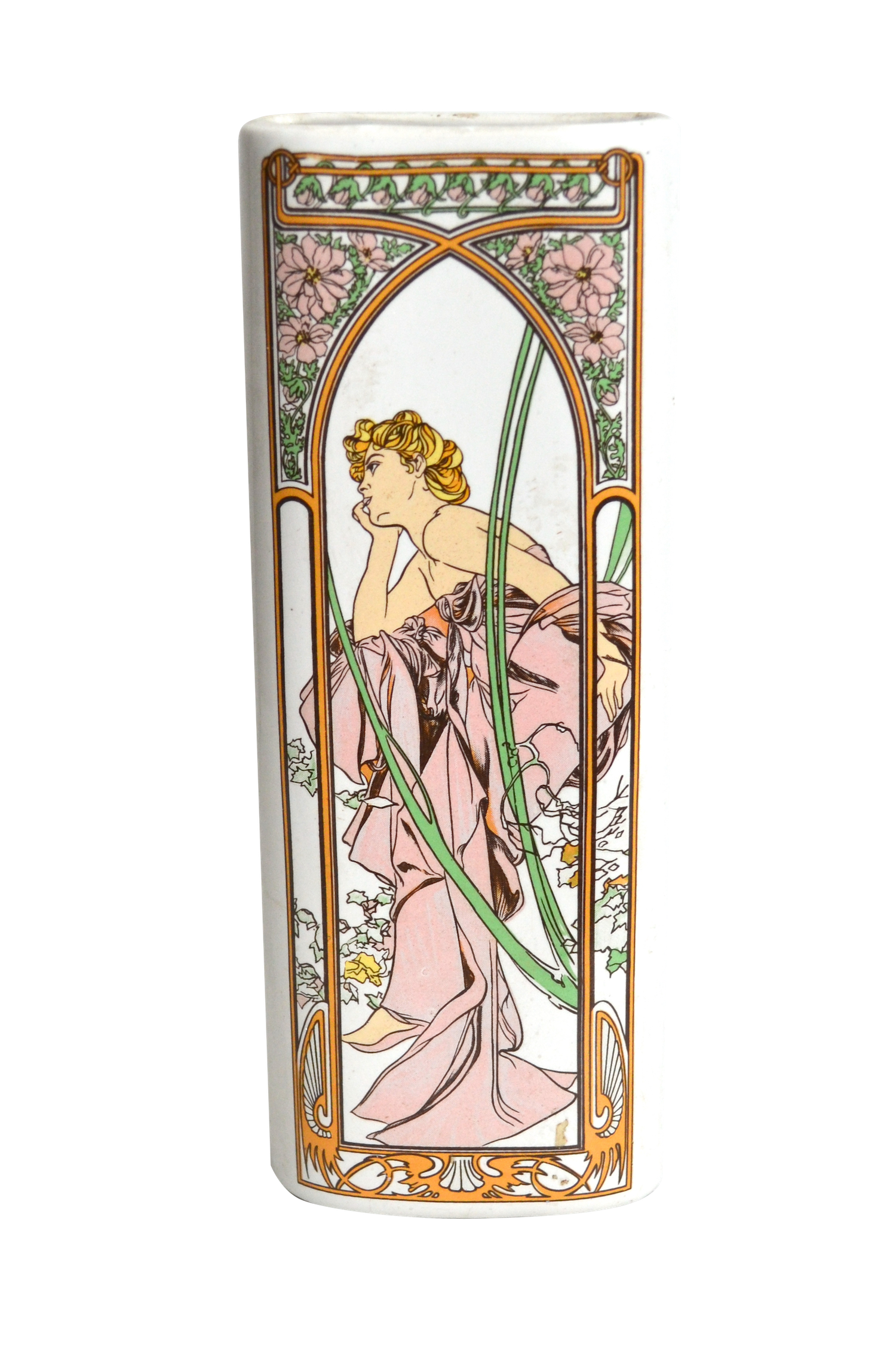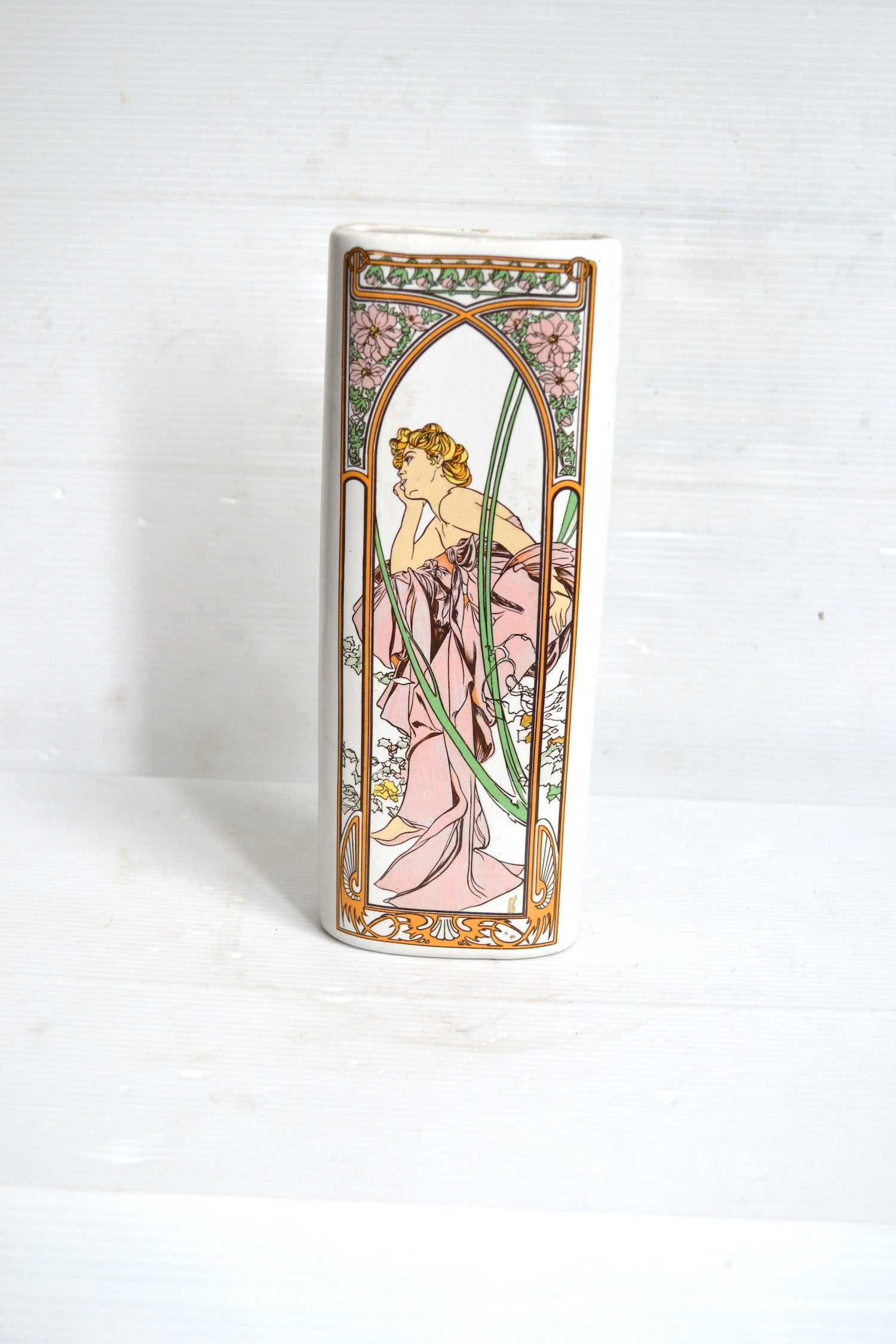 Ce superbe vase mural est une représentation d'une célèbre œuvre d'Alfons Mucha Rêverie du Soir. On y distingue une jeune femme entourée d'un décor floral et de multiples formes géométriques très graphiques. Les couleurs vont du crème au marron en passant par le rose ou le vert.