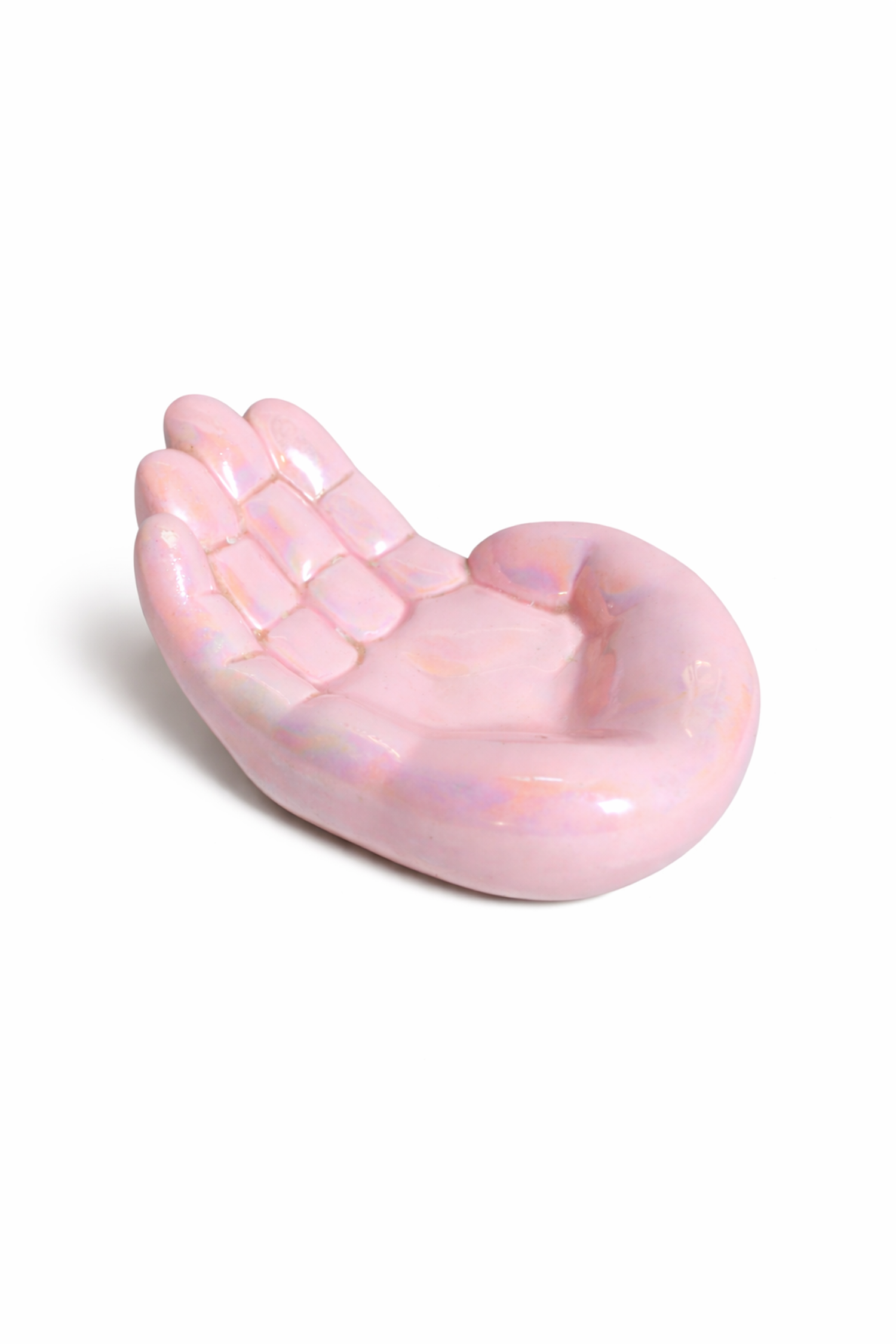 Joli vide-poche main en céramique coloris rose irisé pouvant se placer sur une tablette d'entrée ou à utiliser comme porte-savon dans une cuisine ou une salle de bain !