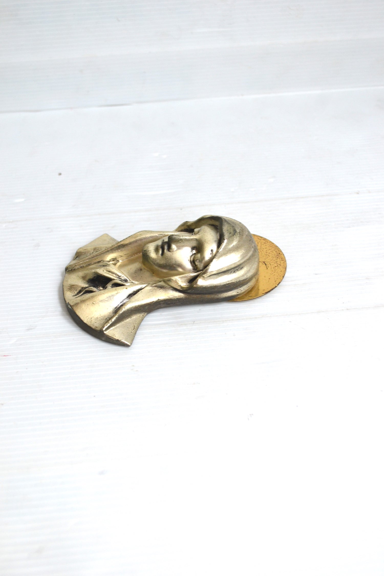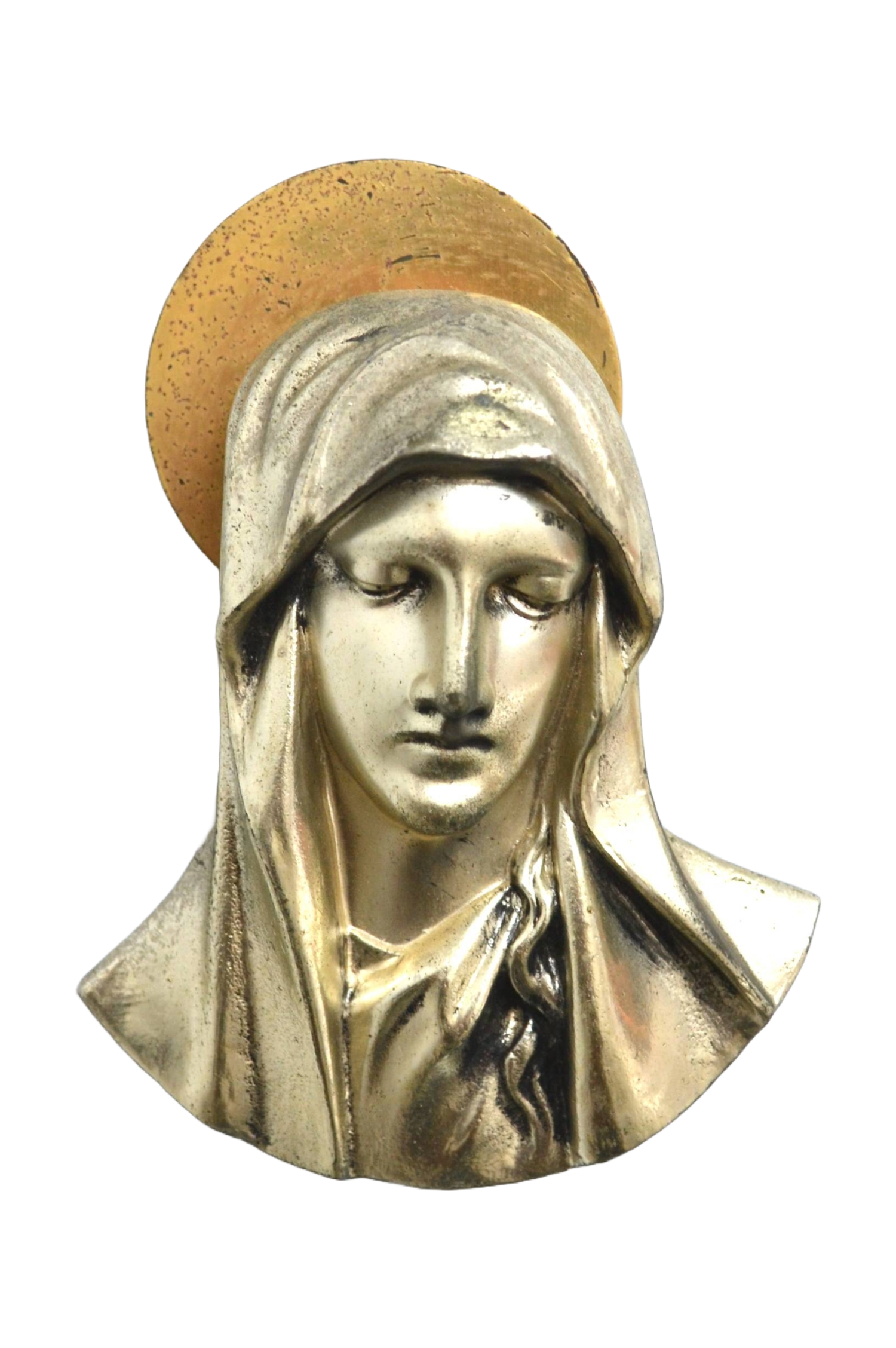 Très belle représentation du visage de la Vierge sous forme de plaque en métal en relief.